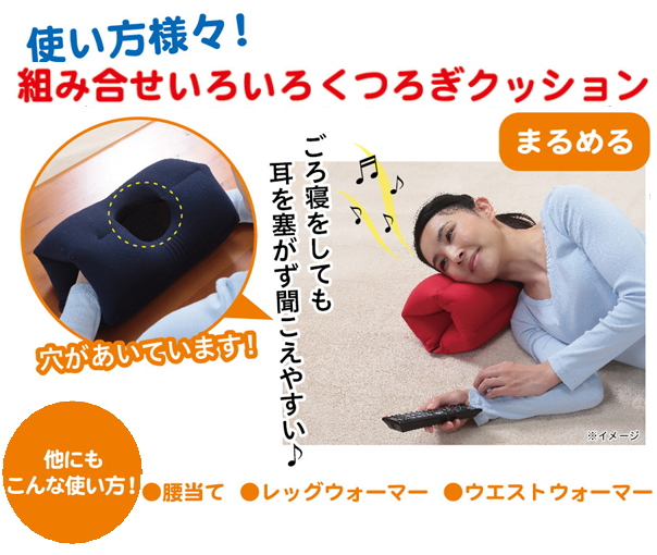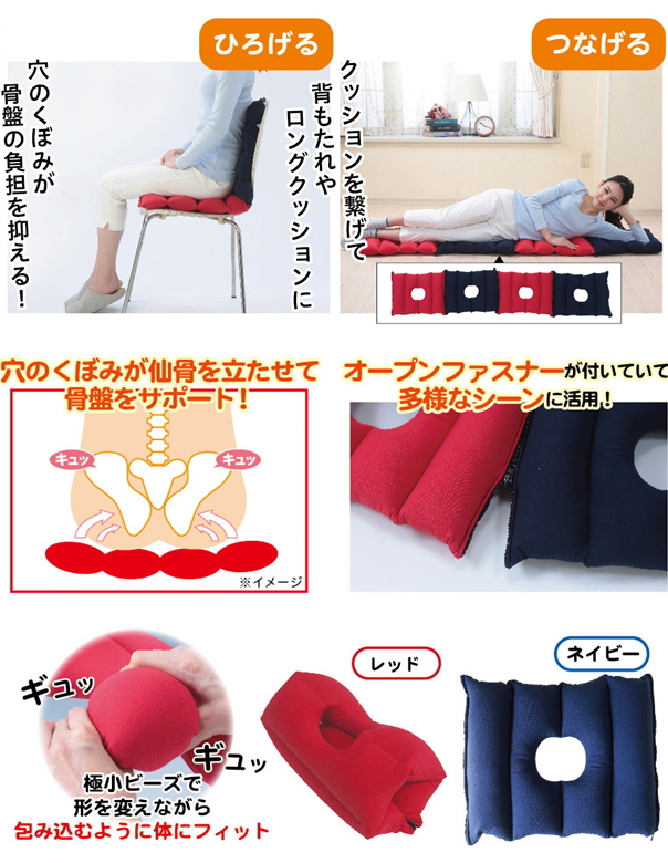 とことんくつろげる!いろいろ使えるごろ寝クッション◆まるめる・ひろげる・つなげる!組み合わせいろいろごろ寝クッション!◆丸く穴が開いているので、ごろ寝をしても耳をふさがず音が聞こえる!◆オープンファスナー付きでつなげて使用可能。◆極小ビーズのクッションで、形を変えながら包み込むように体にフィット!◆穴のくぼみが仙骨を立たせて骨盤をサポート![商品仕様]■カラー:レッド、ネイビー■サイズ(約):W41×H6×D36cm■重量(約):270g■材質:●生地/ポリエステル、ポリウレタン、綿 ●中材/発泡ポリスチレン■生産国:ベトナム