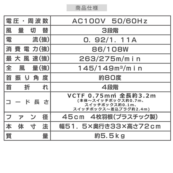| 本体サイズ | 【扇風機】 ・サイズ:幅51.5×奥行33×高さ71cm、重量:約5.5kg ・生産国:フィリピン |
