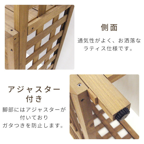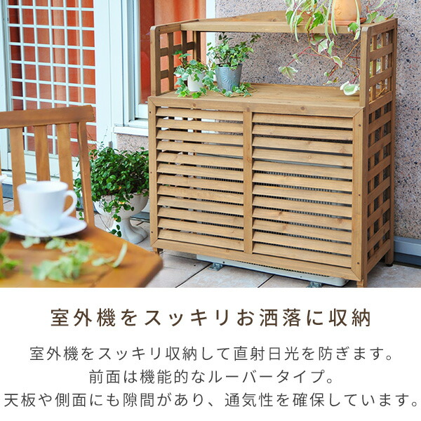 | 備考 | ●前面はオシャレなルーバー仕様 ●自然な風合いでおしゃれに目隠し ●室外機収納部内寸 : 幅89 奥行36 高さ73cm ●棚内寸 : 幅89 奥行36 高さ26cm ●脚部アジャスター付 | |||