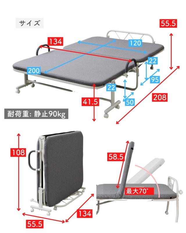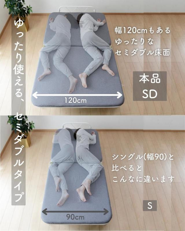 | 商品説明 | ●掃除やしやすくて部屋も広く使える、山善の折りたたみベッド ●ゆったり寝返りが打てる、幅120のセミダブルサイズ ●リクライニングでリラックスできる、薄めのマットレス付き ●立ち座りしやすい、床面ハイタイプ ●フレーム下を収納スペースにも使える、新バネ採用 ●折りたたむと約1/4の長さになって、スペースを広く利用可能 ●折りたたんで移動もしやすいキャスター付き(うちストッパー付き2個) ●折りたたみ時サイズ:幅55.5 奥行134 高さ108cm ●床面サイズ:幅123 奥行201cm ●床面高さ:41.5cm ●ベッド下高さ:【足元】高さ22 幅50cm、【頭側】高さ22 幅95(高さ30のとき、幅75)cm ●リクライニング時背もたれ:長さ58.5cm、最大角度70度 ●2022年12月1日よりリニューアル品を販売 ・立ち座りのしやすい床面ハイタイプに。 ・フレーム下は収納にも使える新スプリング式。 ・中間取っ手を追加して、サイドアームは着脱可能に。 |