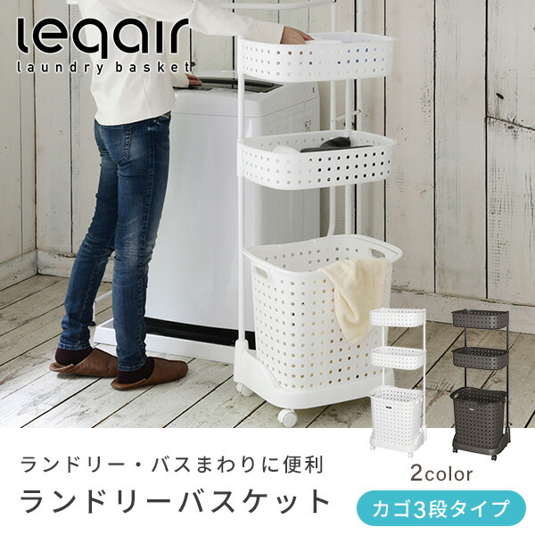 ランドリーバスケット 3段 キャスター付き 幅45 奥行35 高さ109cm レクエア バスケット カゴ 洗濯かご 洗濯カゴ 洗濯物入れ 脱衣カゴ 洗面所 収納 ホワイト 白 おしゃれ 日本製 JEJアステージ 【送料無料】