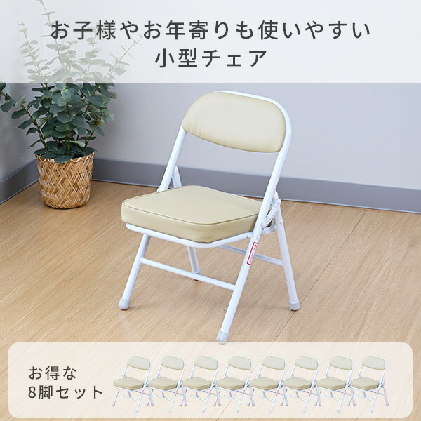 | 商品説明 | ●まとめ買いにお得な8脚セット ●お子様やお年寄りも使いやすい小型チェア ●座りやすい厚みのあるクッション ●座面高さ:28.5cm ●座面サイズ:幅27×奥行27cm ●折りたたみサイズ:幅34.5×奥行8×高さ69cm ※カラー表記:IV(アイボリー)となっておりますが、ベージュに近いお色となります |