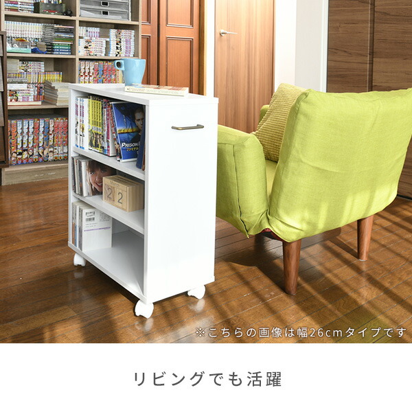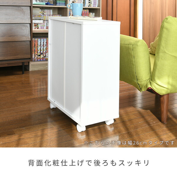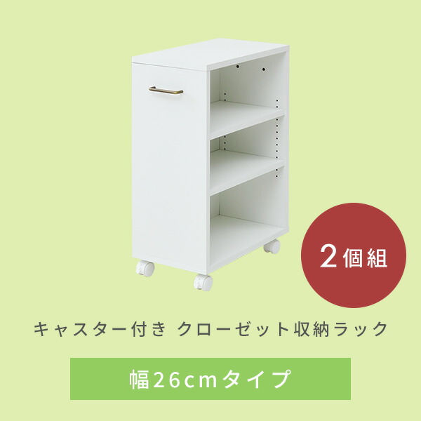| 商品説明 | ●こちらは2個セットの商品になります。 ●クローゼットにもすっきり入るキャスター付き収納ラック ●幅26cmでA4用紙も収納可能、書類整理ラックとしても便利 ●取っ手付きで移動もラクラク ●取っ手位置は左右選択可能 ●棚板2枚、2cm間隔13段階で棚位置可動 ●取手を含まない本体奥行:45cm ●背面化粧あり ●キャスター4個(うちストッパー付き2個) ●耐荷重:天板15 棚板各5 底板10 全体35kg ※2021年5月17日より、本体ツヤのないホワイトに変更してリニューアル販売となります。 |