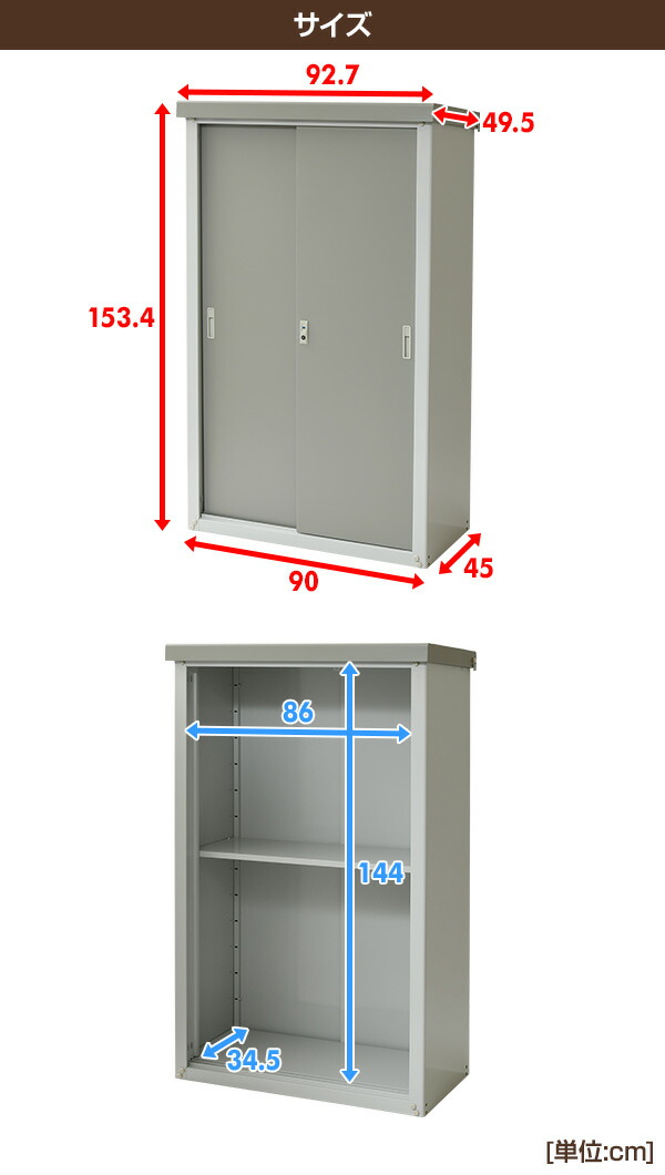 | 商品説明 | ●コンパクトタイプのスチール物置 ●ハイテンション亜鉛メッキ鋼板採用で硬度UP ●扉に吊り戸式を採用し、開閉がスムーズ ●安心の専用鍵付き ●収納物が出し入れしやすい下部レール部フラット仕様 ●収納部内寸:幅86×奥行34.5×高さ144cm ●可動棚1枚(高さ約10cmピッチ) ※2018年12月18日よりカラーと扉デザインをリニューアルしました ●耐荷重:(底板)約100kg、(棚板)約30kg ※完全防水仕様ではないため、吹き込みなどによる雨水侵入のおそれがあります |