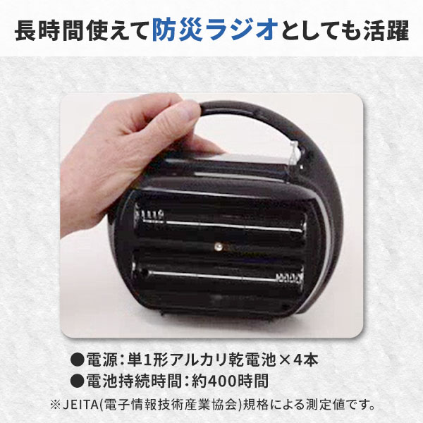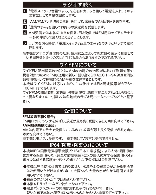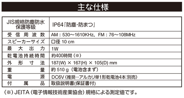 | 商品説明 | ●電源:DC6V (単1形アルカリ乾電池×4本使用 別売り) ●乾電池持続時間目安:約400時間 ●水しぶきとホコリに強いIP64相当(防塵・防まつ) ※水の飛まつ程度ですので大量の水をかけたり、水中に入れることは出来ません ●受信周波数:(AM)530-1610KHz (FM)76-108MHz ●スピーカーサイズ:口径10cm ●最大出力:1W ●ワイドFM対応 ※2017年リニューアルし復活しました 一部色のリニューアル IP64 相当(防塵・防まつ) ワイドFM搭載 |