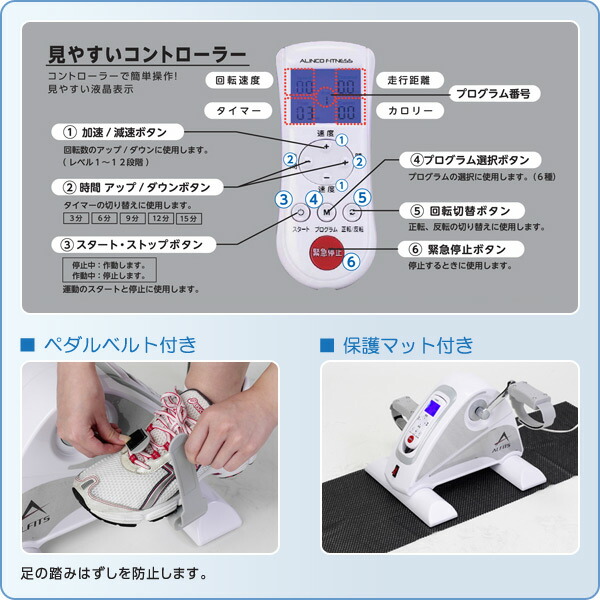 | 商品説明 | ●ペダル部分のみのシンプルな電動サイクル ●自宅のイスを使って手軽にサイクル運動が出来る ●ペダルが自動で回転するアシスト機能を搭載 ●テーブルの上に本体を置いて手でペダルを回せば腕のシェイプアップも可能 ●寝ころんだ状態でもバイク運動が可能。カラダに負担を掛けずラクに運動ができる ●コンパクトで置き場所を選ばなず、持ち運びもラクラク ●スピード12段階調節可能 ●回転切替ボタンで正転/反転の切り替えが可能 ●リモコンで簡単操作が可能(スタート/ストップボタン、スピード、タイマー、プログラム、正転/反転切替、緊急停止) ●足の踏み外しを防ぐペダルベルト付き ●保護マット付き ●電源:AC100V 50/60Hz ●消費電力:12W ●使用体重制限:90kg ●連続使用定格時間:15分 ※この商品は、2022年6月20日より型番が変更になっております 【変更点】型番AFB3016→AFB3022 |