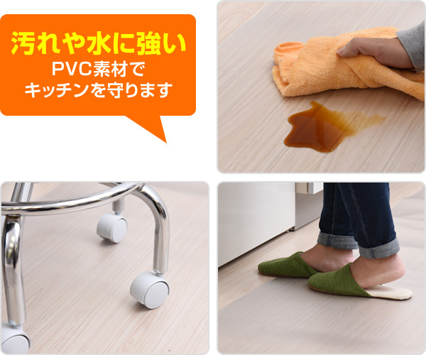 | 商品説明 | ●シンク周りやテーブル周りの床面を傷や汚れから守る保護マット ●お部屋のイメージを損ねないクリアタイプ ●ダイニングチェアの下にも使用可能 ●食べこぼしなどで汚れてもサッと拭き取れるPVC素材 ●耐熱性があるので床暖房の上でも使用OK シボ面(ザラザラした面)を上面にしてご使用ください。 ※耐熱温度(-10℃〜80℃)の範囲内でご使用ください。 ※床の材質や上に載るものの形状などによって効果に差は生じ、完全に傷や凹みを回避するものではございません。 |
