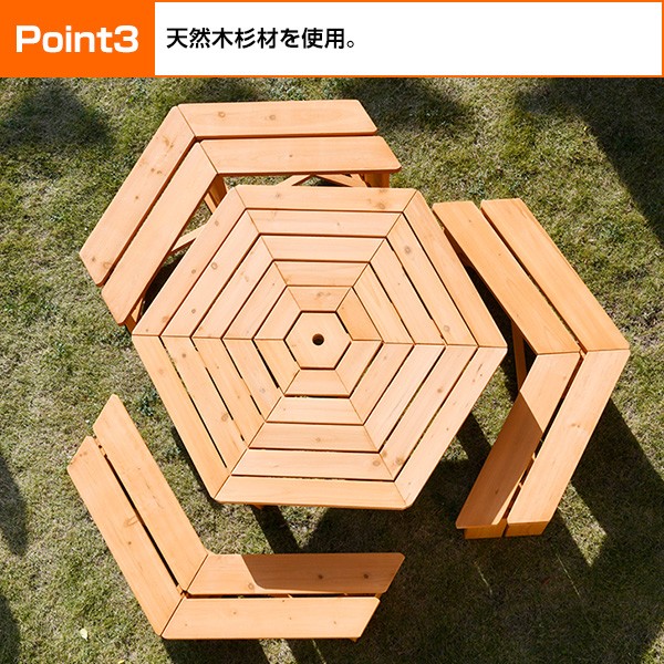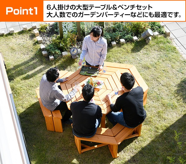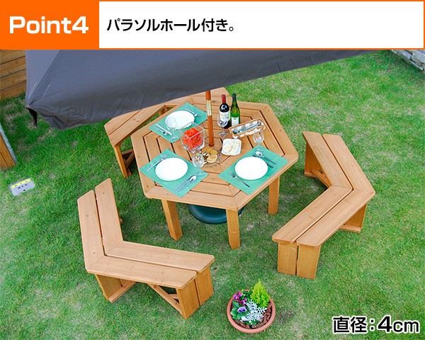 | 商品説明 | ●大人数でのガーデンパーティーなどにも対応した大型テーブル&ベンチ4点セット ●BBQ対応仕様:テーブル中央にコンロ用スペース付き コンロスペース:直径35.5×深さ12cm ●パラソルホール付き 穴径:約4cm ●大人6人がゆったり座れる ※2019年2月12日よりテーブルのサイズが一部変更になりました テーブル「幅130cm→126cm」「奥行130cm→116cm」「高さ68cm→66cm」 |