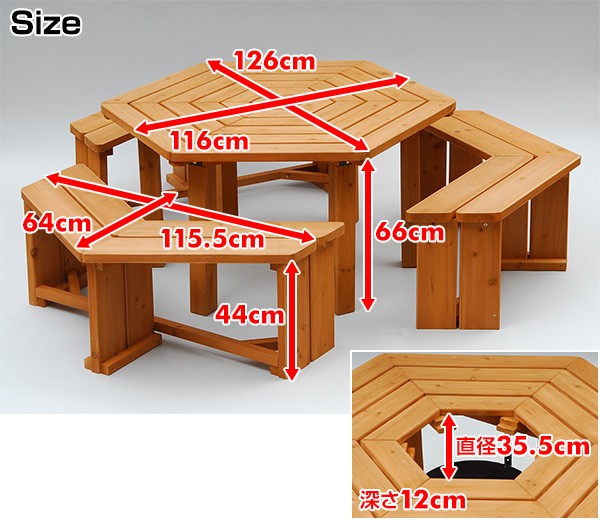 | 本体サイズ | テーブル:幅126×奥行116×高さ66cm 重量20kg ベンチ:幅115.5×奥行64×高さ44cm 重量11kg |