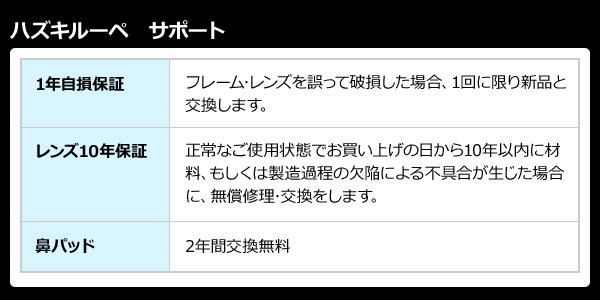 | 本体サイズ | 本体:幅14.5×高さ4.5cm レンズサイズ:幅12.86×高さ4.25cm フレーム長さ:16.45cm 重量:26.5g |