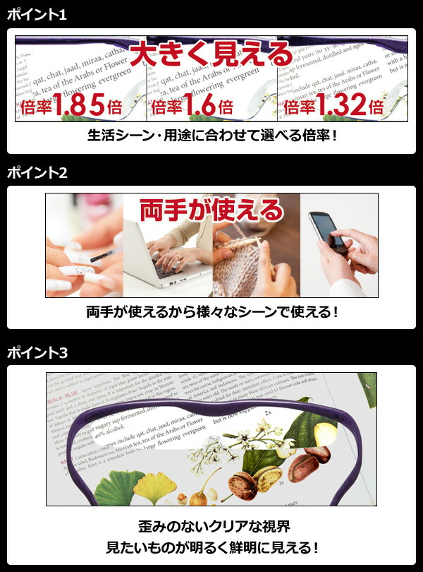 | 商品説明 | ●拡大倍率:1.85倍 ●耐荷重:70kg ●レンズ種類は2種類:(クリアレンズ)ブルーライト35%カット (カラーレンズ)ブルーライト55%カット ●屈折率:3.4Dpt ●焦点距離:手元での作業(22-28cm) ●UVカット:UV紫外線99.99%カット ●メガネ・コンパクトとは異なり大きく見える機能をもった両手が使えるメガネ型のルーペ ●裸眼の方はそのまま、近視・乱視・老眼の方はお手持ちのメガネ・コンタクトの上からも掛けられます ●衝撃に強い、柔軟性のあるフレームで軽い掛け心地 ●セット内容:本体、専用ケース、レンズクロス、使用説明書兼保証書 ●キレイな化粧箱でのお届けだからプレゼントに最適 ●1年自損保証(フレームを誤って破損した場合、1回に限り新品と交換いたします ●レンズ10年保証(正常なご使用状態でお買い上げの日から10年以内に材料、もしくは製造過程の欠陥による不具合が生じた場合に、無償修理・交換をします) ●鼻パッド2年交換無料 |