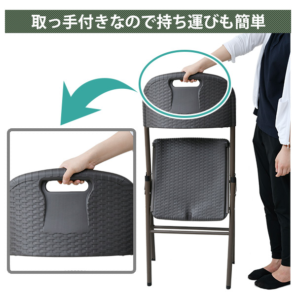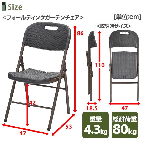 | 商品説明 | ●ラタンの風合いを再現した樹脂製のウィッカー調ガーデンチェア4脚セット ●折り畳んでコンパクトに収納可能 収納時サイズ:幅47×奥行18.5×高さ110cm ●樹脂製なので、汚れても水洗いができてお手入れも簡単 ●座面高さ:42cm ●総耐荷重:80kg ※2024年4月25日からチェアの仕様を一部変更しております。 |