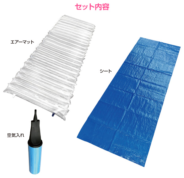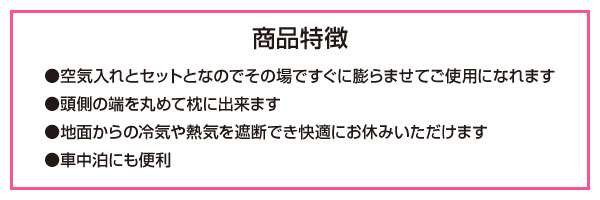 | 商品説明 | ●空気入れとセットとなのでその場ですぐに膨らませてご使用になれます ●頭側の端を丸めて枕に出来ます ●地面からの冷気や熱気を遮断でき快適にお休みいただけます ●車中泊にも便利 ●最大耐荷重:約120kg |