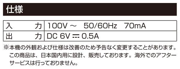 | 商品説明 | ●手元スピーカーYTS-30、YWTS-800用ACアダプター ●入力:100V(50/60Hz) 70mA ●出力:DC6V(0.5A) |