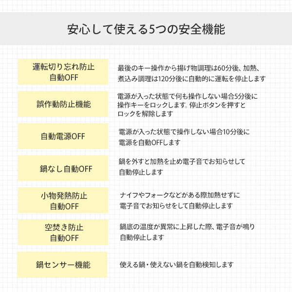 - 息子の一人暮らしに購入。 ガスコンロとIHクッキングヒーター迷いましたが、安全性を考えIHにしました。 安全機能も付いて、火力調整も出来て、調理するには充分です。 スタイリッシュで、フラットなので、油ハネしても、掃除しやすいと、言ってました。 お勧めですね