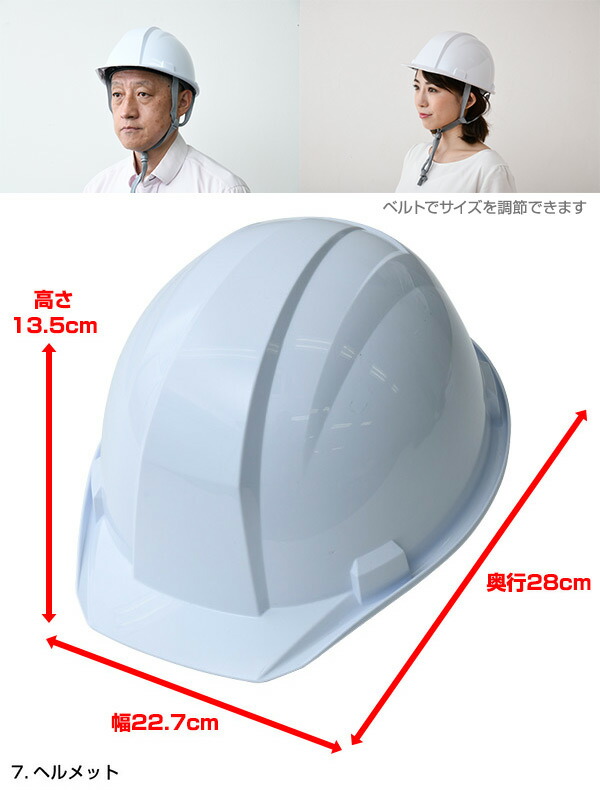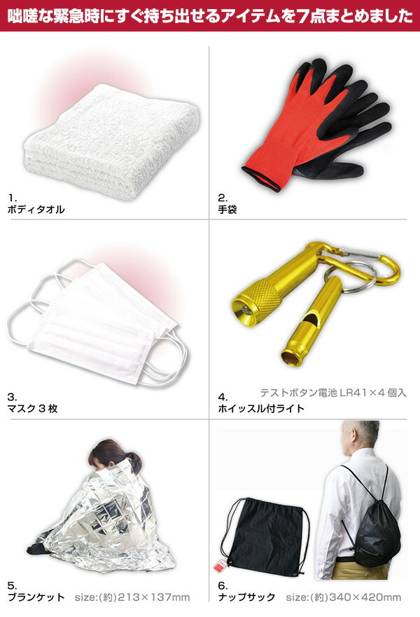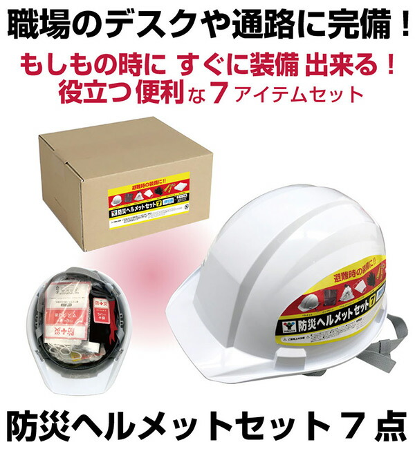 | 商品説明 | ●ヘルメット外寸:幅22.7×奥行28×高さ13.5cm ●咄嗟な緊急時にすぐ持ち出せるアイテムを7点まとめました ●職場のデスクや通路に完備! ●セット内容:ヘルメット、ボディタオル、手袋、マスク3枚、ホイッスル付きライト(テストボタン電池入り)、ブランケット、ナップサック ●ブランケットサイズ:213mm×137mm ●ナップサックサイズ:340mm×420mm |