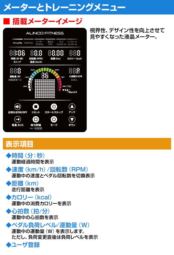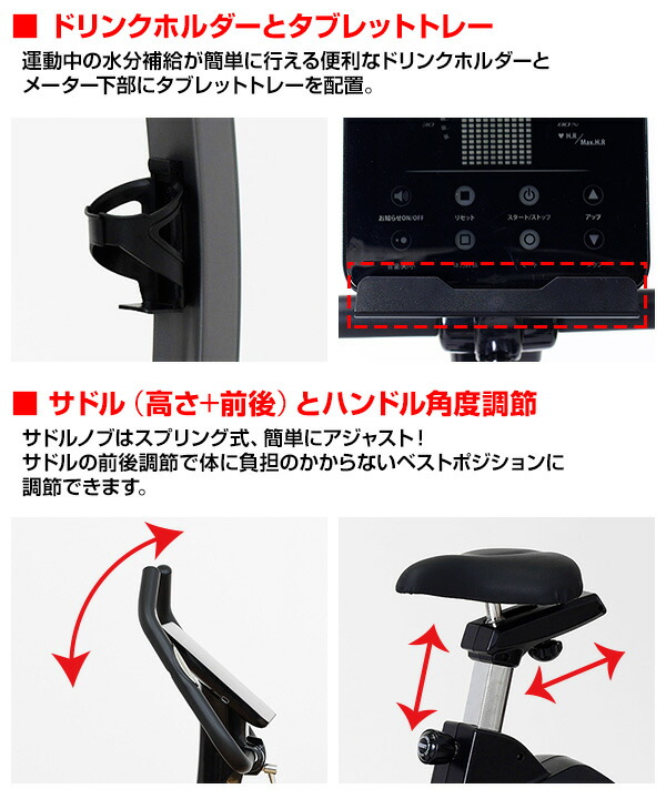 | 商品説明 | ●サドル高さ:85.5〜109cm(3cmピッチ9段階) ●電源:AC100V 50/60Hz ●消費電力:50W ●電気代の目安:約21円/月(1日あたり30分) ※電力料金単価27円/kwhで算出 ●スポーツクラブでも採用されている電磁負荷方式 ●ペダルが360度どこにあるときも滑らかで均一な負荷が得られるので、ストレスの掛からないスムーズな運動が行える ●表示メーターはシンプルな形状の液晶メーターで、操作性・視界性が向上 ●中央部に運動強度が確認できるハートレートモニターを搭載し、その他にも運動中にスマートフォンなどを充電することができるUSB電源充電機能が搭載されている ●本格的な機能や多彩なプログラムが効果的な運動をサポートするので、スポーツクラブに通わなくても自宅で快適な運動が行えるマシン ●運動中の水分補給が簡単に行える便利なドリンクホルダーとメーター下部にタブレットトレーを配置 ●足の踏み外しを防ぐペダルベルト付き、ペダルはどなたでも使える幅広サイズ ●サドル高さと前後位置調節とハンドル角度調節が可能、体に負担のかからないベストポジションで調節できる ●年配の方や女性の方でも楽に移動できるキャスター付き、使用後は部屋の隅に移動できる メーター表示項目:時間、速度/回転数、距離、カロリー、心拍数、ペダル負荷レベル/運動量、ユーザ登録 ●心拍数測定機能付き(グリップセンサー) ●運動後、1分間の心拍数の戻り具合を6段階で評価する体力評価ボタン付き |