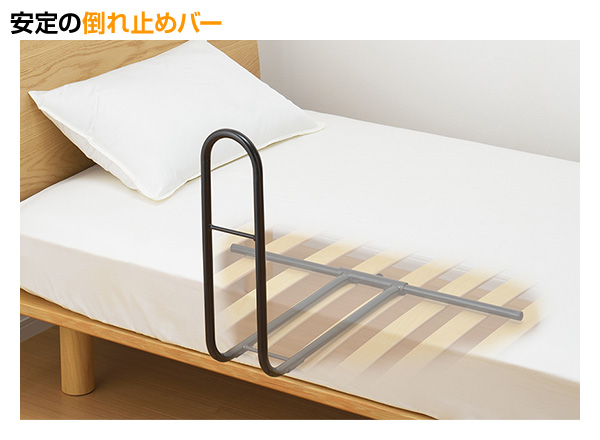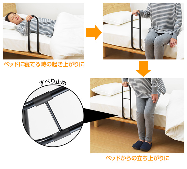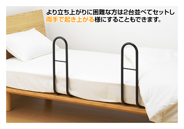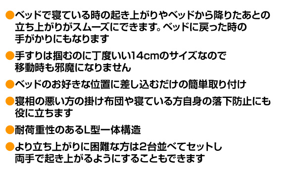 | 商品説明 | ●ベッドで寝ている時の起き上がりやベッドから降りたあとの立ち上がりがスムーズにできます。ベッドに戻った時の手がかりにもなります ●手すりは掴むのに丁度いい14cmのサイズなので移動時も邪魔になりません ●ベッドのお好きな位置に差し込むだけの簡単取り付け ●寝相の悪い方の掛け布団や寝ている方自身の落下防止にも役に立ちます ●耐荷重性のあるL型一体構造 ●より立ち上がりに困難な方は2台並べてセットし両手で起き上がるようにすることもできます ※ベッドは付属しません。手すりのみの販売となります ※薄いマットレス(目安16cm以下)や敷き布団など製品に荷重が掛からないものには設置しないでください |
