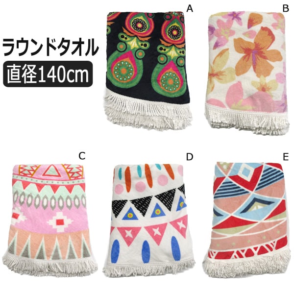 | k0346/レディース ラウンドビーチタオル Aグリーンペイズリー/Bスウィートフルール Cラウンドトライアングル/Dサワーカクテル/Eガイア | ||