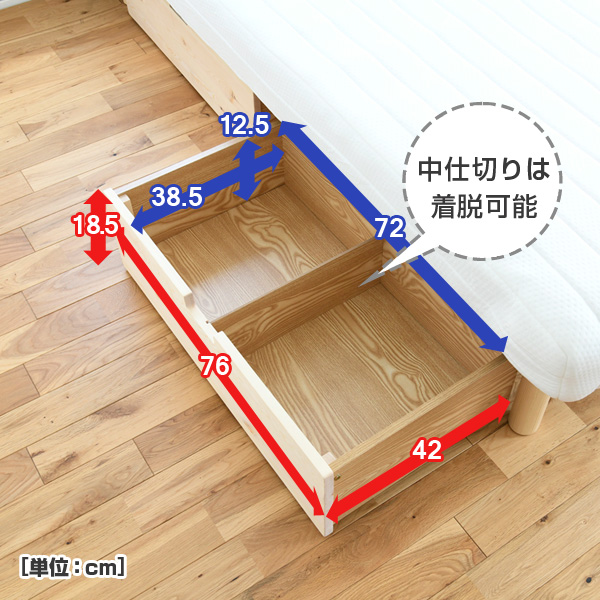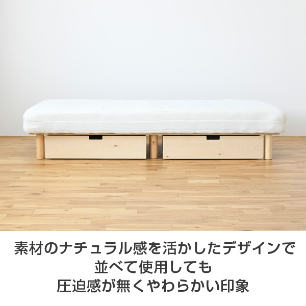 | 商品説明 | ●ベッド下を活用する、キャスター付き収納ボックス2個セット ●前板はお部屋にぬくもりをプラスするパイン材仕様(無塗装) ●中央に仕切り板が1枚付いて、収納スペースを区切って利用可能 ●中は木目調の樹脂コーティングされており、お手入れもラクラク ●前後方向に動くキャスター付きで出し入れサポート ●引き出し内寸:幅72 奥行38.5 深さ12.5cm ●裏面にはしっかり補強桟も入ったしっかり構造 ●耐荷重15kg |