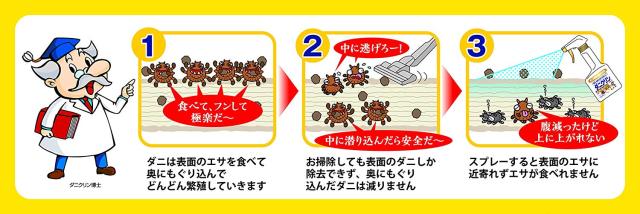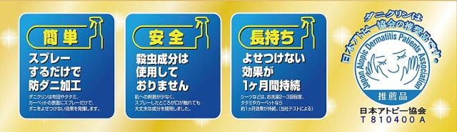 | 商品説明 | ●サラッと乾くスプレータイプのダニ忌避剤 ●後から生まれてくるダニにも効果を発揮しダニを減らします ●シーツなどお洗濯するものは、お洗濯2-3回程度、タタミやカーペットなら約1か月効果が持続 ●殺虫成分不使用だから赤ちゃんやペットのいるご家庭でも安心してご使用いただけます ●無香料タイプ ●日本アトピー協会の推奨品 ●ベッド、ふとん、ソファ、カーペット、ぬいぐるみ、クッションに |