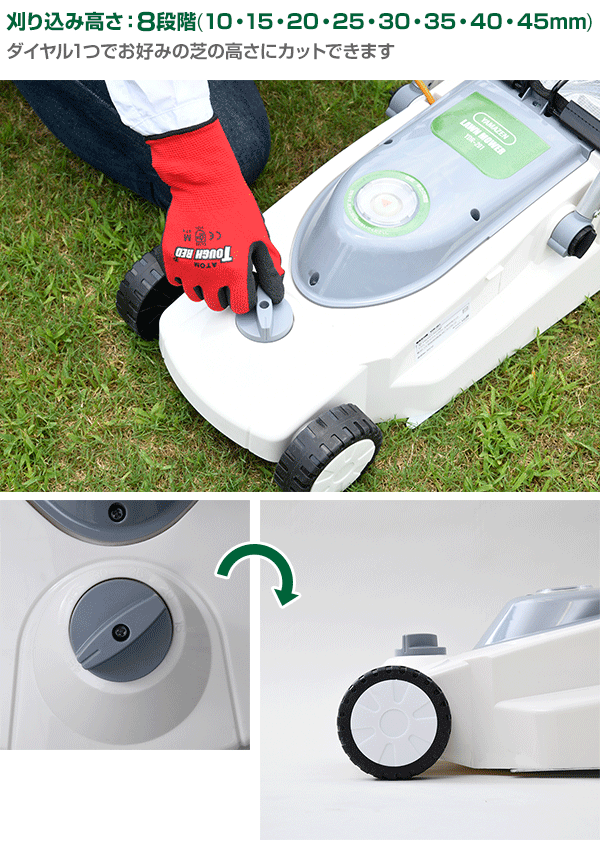 | 商品説明 | ●電圧:交流100V 50/60Hz ●消費電力:650W ●電流:6.5A ●回転数:約7800min-1 ●刈り込み高さ:8段階(10・15・20・25・30・35・40・45mm) ●刈り込み幅:約200mm ●絶縁方式:二重絶縁 ●定格時間:約30分 ※1時間あたりの刈り込み面積(目安):約25坪 ●付属品:芝刈機本体×1、集草バック×1、延長コード10m(VCT7A 2×0.75mm2)×1、ボックスレンチ×1、ベルトフック×1、コードストラップ×1、スパナ×1、コードフック×1、取扱説明書×1 ●水平回転するロータリー式カッター刃で芝をカット 「200×25.4×8P」の金属8枚刃 ●はらうように刈るので、長く育った芝もスムーズに刈れます ●芝の高さを8段階(10から45mm)に調整可能 ●中身が見える集草バッグ付き ●替刃交換が簡単 ※2018年5月8日より下記の点をリニューアルしました ・一部パーツのカラーが変更になりました ・消費電力が「500W」から「650W」に変更になりました ・電流が「5.3A」から「6.5A」に変更になりました |