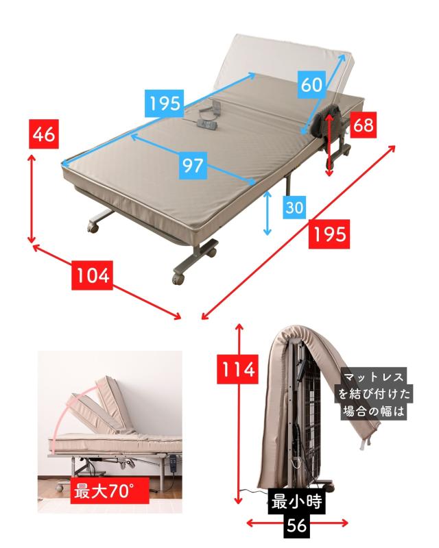 | 商品説明 | ●キャスター取り付け済み、本体完成品でのお届け。手すりのみお客様取り付け(六角レンチ付属) ※重いため、お二人以上での搬入をお願いします。 ※2026年2月12日より、仕様変更して再販いたします。 【変更点】(1) マットレスが高反発・1枚ものに (2)リクライニングが背もたれのみに (3)取っ手が寝起きしやすい手すりタイプに (4)カバーを取り外して洗濯可能に ●マットレス一体型の、電動リクライニングベッド ●高反発ウレタンフォームを使った、寝返りのしやすいマットレス(着脱は不可) ●マットレスの上部はファスナーで付け外しができ、洗濯機で洗濯可能(要ネット使用) ●一枚ものなので、従来の折りたたみベッドに比べて越し当りを改善 ●いざとなったらたたんで移動もできる、折りたたみ&キャスター付き ※マットレスがしっかりしているので、折りたたみ作業時はマットの結び目を解除して動かしてください。 ●寝起きもしやすい床面ハイタイプ ●寝起きをサポートする手すり付き、左右どちらにでも設置可能 ●背もたれの電動リクライニングは、手元のリモコンでラクラク操作 ●モーター部、リモコンには1年保証付き ●手すりにはリモコンや携帯をしまえる小さなポケット付き ●ベッド下はモーターやスプリングがあるため収納には使用不可 ●荷重の目安: 静止90kg ●床面サイズ: 幅97 長さ195cm ●床面高さ: 46cm ●ベッド下高さ: 30cm ●背もたれ高さ: 60cm ●背もたれリクライニング: 約70度 ●リモコンコード長さ:120cm ●定格周波数50/60Hz、消費電力33W ●最小折りたたみ時:幅56 奥行104 高さ114cm |