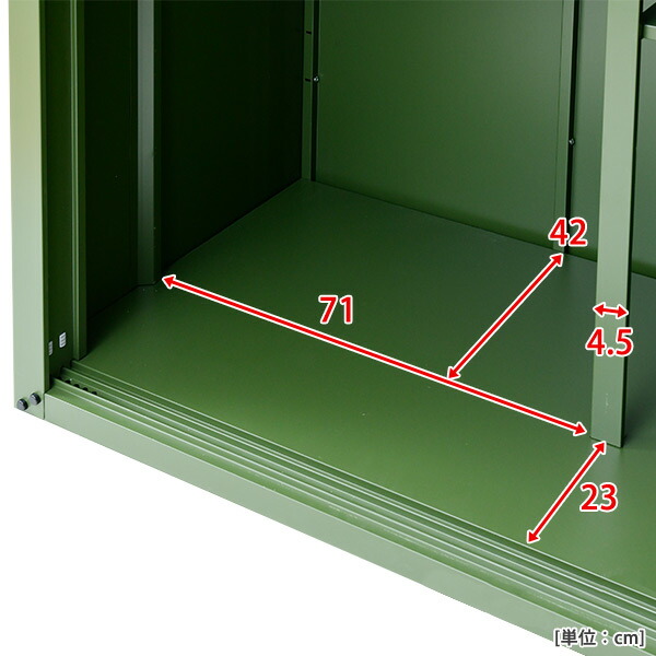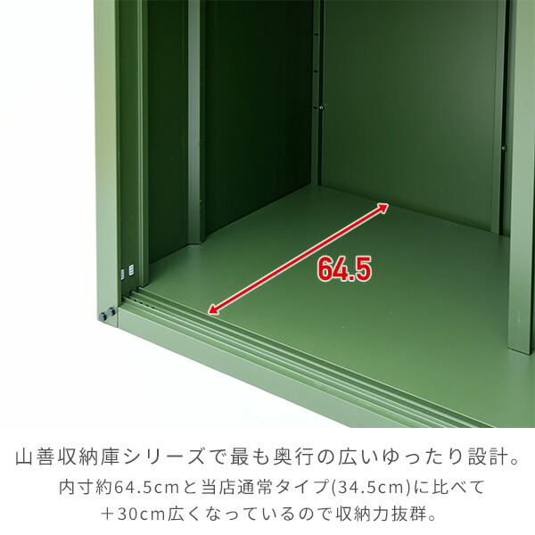 | 商品説明 | ●奥行ゆったり仕様でタイヤも収納できる大容量のスチール製収納庫 ●奥行(内寸)を通常タイプよりも+30cm広い64.5cm確保 ●日用品の収納だけでなくキャンプ用品などの収納にも最適 ●お庭のグリーンにマッチするカーキ色 ●サビに強い:ハイテンション亜鉛メッキ鋼板採用で硬度UP ●扉に吊り戸式を採用し、開閉がスムーズ ●収納物が出し入れしやすい下部レール部フラット仕様 ●安心の専用鍵付き ●収納部内寸:幅146×奥行64.5×高さ98.5cm ●可動棚ハーフ1枚付属 ●可動段数:7段 ●耐荷重:(底板)約100kg、(棚板)約30kg ※完全防水仕様ではないため、吹き込みなどによる雨水侵入のおそれがあります ※2022年1月14日販売分よりデザイン(見た目)、カラーをリニューアルしました ※旧タイプをお持ちの方は追加購入時はデザインが異なりますのでご注意ください |