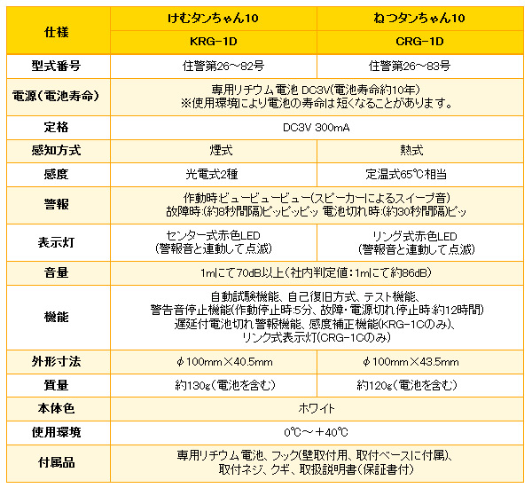 | 商品説明 | ●まとめ買いにお得な4個セット ●音と光で知らせる火災警報器 ●台所に最適 ●火災の熱を感知する ●電池寿命約10年 ●自動試験機能付 ●この商品は日本消防検定協会の試験に合格した検定品です。 ●電源:専用リチウム電池DC3V 300mA ●感度:定温式65℃相当 ●音量:1mにて70dB以上 |