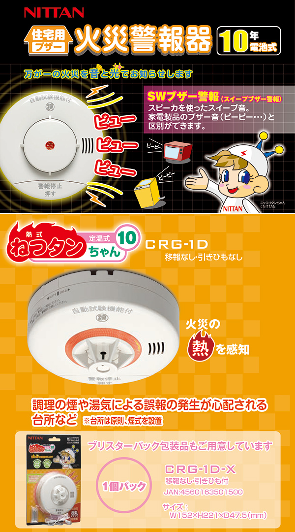 【4個セット】 ニッタン NITTAN 火災報知器 火災警報器 家庭用 住宅用 熱式 10年 ねつタンちゃん10 日本製 CRG-1D-X*4 【送料無料】