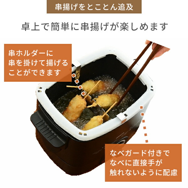 - 友達達と串揚げパーティーする為に購入しました。ガスと違って温度設定はほっといても同温度を保ってくれるし、そこそこ容量あるから1人2本ずつ×4人=8本ぐらい投入しても充分火が通りカラッと美味しく揚げてく...
