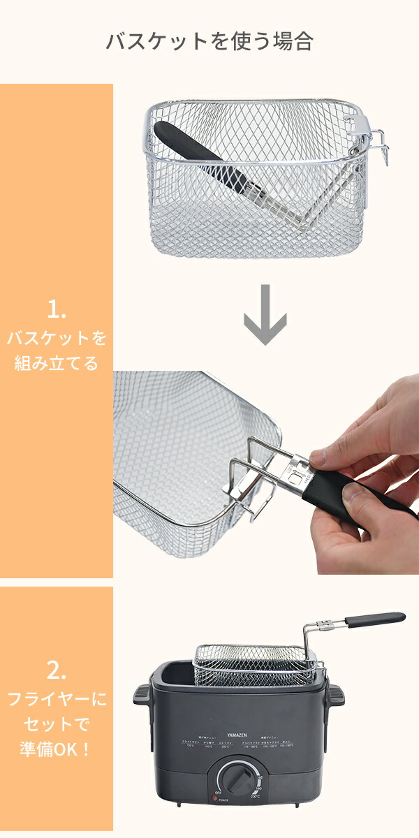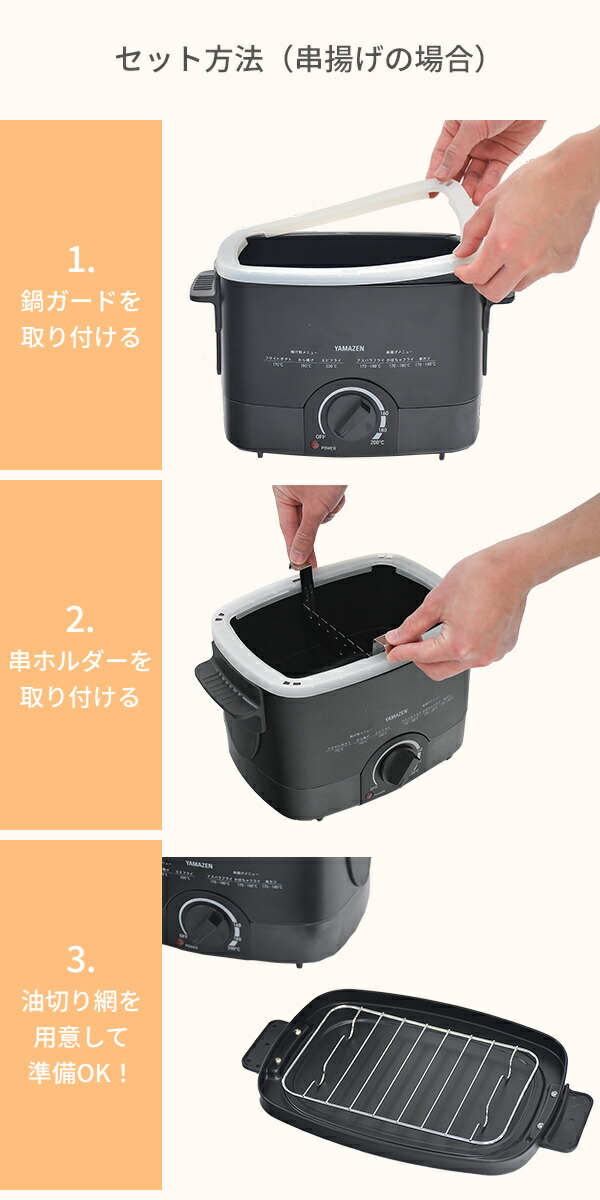 YAMAZEN,ヤマゼン,山善,通販,卓上フライヤー,電気フライアー,フライ,揚物,あげもの,串かつ,えびフライ,串揚げ,天ぷら,から揚げ,フライドポテト,ドーナツ,野菜天ぷら,コロッケ,一口カツ,ポテトチップ,かき揚げ,から揚げ,エビフライ,魚介類フライ,かぼちゃ,アスパラ,なす,しいたけ,ししとう,ねぎ,カツ,エビ 99786 |