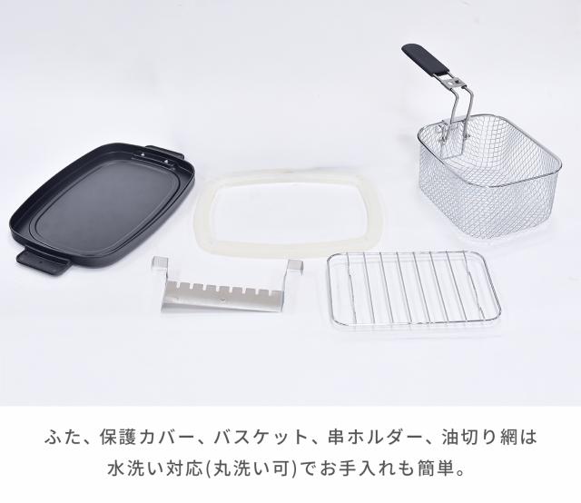 | 商品説明 | ●電源:AC100V(50/60Hz) ●消費電力:1250W ●コード長:約1.8m ●定格容量:約1.1L(油量:1000g) ●温度調節:約160度から約200度(油温) ●安全装置:温度ヒューズ ●付属品:串ホルダー、鍋ガード、取っ手付きバスケット、油切り網(ワイヤータイプ) ※15年変更点:外観デザインを一部リニューアル ●カラー:ブラック |