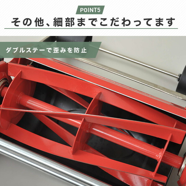 | 商品説明 | ●刈込高さ5段階調節可能:約10・16・23・30・36mm ●刈込幅:約200mm ●ハンドル高さ2段階調節可能 ●5枚刃リール方式 ●刃調整部:業界初、板バネ採用で微妙な調整が簡単に正確な刃調整が可能 ●集草ガイドカバー機構・大型前面キャッチャー採用:刈った芝がキャッチャーに効率良く入る ●付属品:グラスキャッチャー(10リットル) (プラスチックトレイ) ●メーカー保証1年付き ※この商品は、2023年1月25日よりカラー追加しております(ブラック、カーキ) |