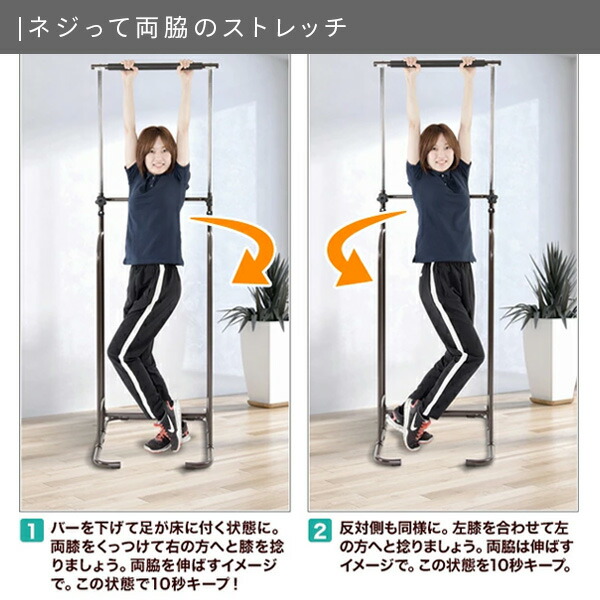 | 商品説明 | ●全身のストレッチ、リフレッシュにオススメのぶら下がり健康器 ●ぶら下がって背筋を伸ばすだけでリラックス ●高さは180・190・200・210・220cmの5段階に調節可能 ●使用体重制限:最大90kg |