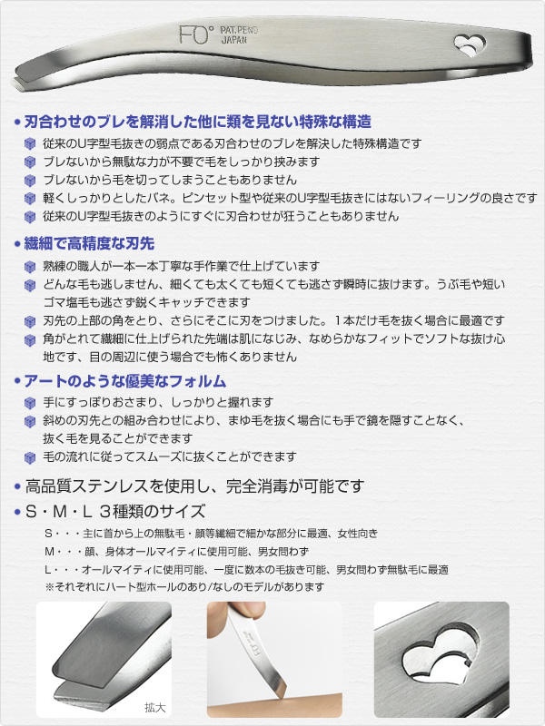 | 商品説明 | ●ハート型のホールが付いたモデルです ●用途:首から上の無駄毛・顔等の繊細な部分に(女性向き) ●刃合わせのブレを解消した特殊構造の毛抜き ●ブレないから途中で毛を切ってしまわない ●繊細で高精度な刃先 ●熟練な職人の丁寧な作業による仕上げ ●アートのような優美なフォルム ●高品質ステンレス使用、完全消毒が可能 ●特許 第5063830号 |
