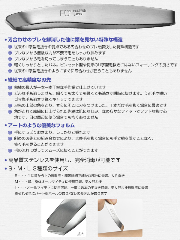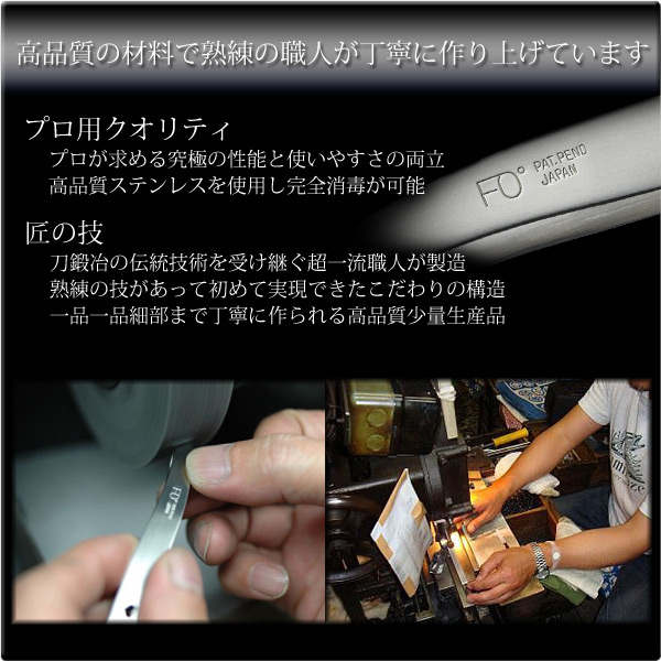 | 商品説明 | ●用途:オールマイティに、一度に数本の毛抜き可能(男女兼用) ●刃合わせのブレを解消した特殊構造の毛抜き ●ブレないから途中で毛を切ってしまわない ●繊細で高精度な刃先 ●熟練な職人の丁寧な作業による仕上げ ●アートのような優美なフォルム ●高品質ステンレス使用、完全消毒が可能 ●特許 第5063830号 |