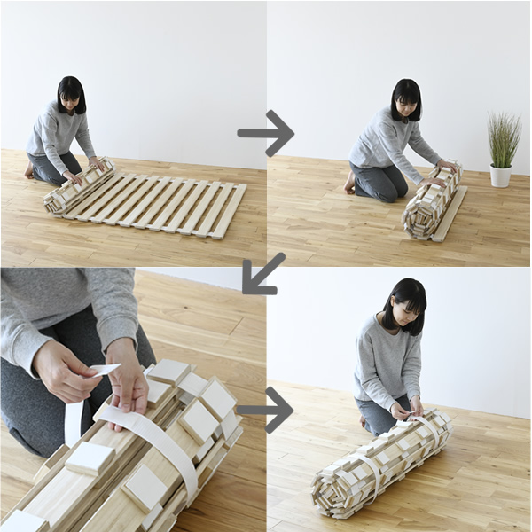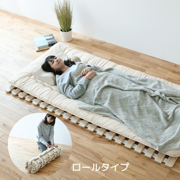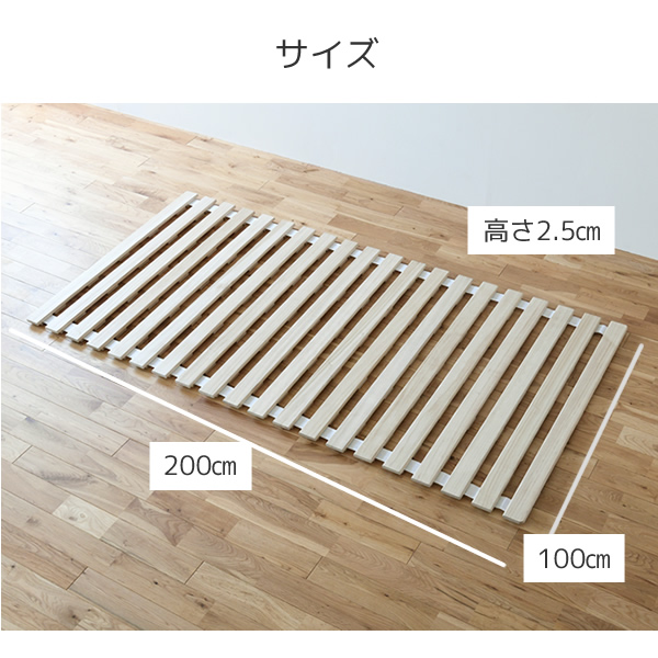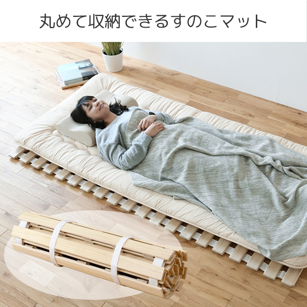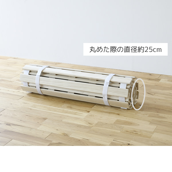 | 商品説明 | ●布団下に敷いて通気性が良くなるすのこベッド ●丸めてコンパクトに収納可能 ●材質は調湿性のある桐を使用 ●すのこ部は布団にやさしい面取り仕上げ ●床に接する面には傷を防止するフェルト付き ●耐荷重:90kg ●丸めた時のサイズ:直径約25cm ※到着時、梱包内に臭いがこもっている場合がございます。換気して使っていただき、気になる場合は店舗までご連絡ください。 |