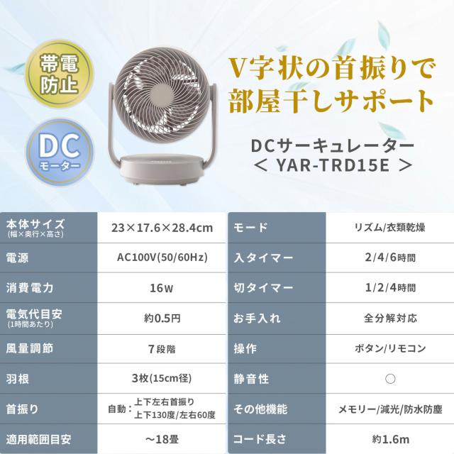 | 商品説明 | ●電源:AC100V(50/60Hz) ●消費電力:16W ●電気代目安(1時間あたり):約0.5円(50/60Hz) ●コード長:約1.6m ●DCモーター搭載 ●羽根:15cm径 3枚 ●風量:7段階 ●Wタイマー搭載:【切】1/2/4h 【入】2/4/6h ●リズム風搭載 ●衣類乾燥モード搭載:本体が上向きの状態から前後30度にV字状に首振りします。最大風量7で運転し、風量の調整はできかねます ●上下左右自動首振り搭載 ●左右首振り角度:約60度 ●上下首振り角度:約130度 ●前ガードに帯電防止加工を施してホコリ等の付着を抑えます ●リモコン搭載:本体に内蔵された磁石により操作部に保持できる ●お手入れ簡単:工具不要で前面ガード、背面ガード、羽根が取り外し可能 ※前面・背面ガード、羽根は水洗い対応 ●畳数目安:18畳まで ●全閉式モーター採用でIP64仕様。浴室での利用や浴室乾燥機との併用ができる防塵・防水仕様 ●メーカー保証:1年間 ※2026年4月から型番をYAR-ND15EからYAR-TRD15Eに変更しております 【仕様変更点】 ・簡易分解モデルから全分解モデルにアップグレード ・上下首振り範囲60度→110度に拡大 ・おやすみモードの無くし、衣類乾燥モードを搭載 ・全閉式モーター採用でIP64取得 ・帯電防止加工の前ガード採用 ・適用畳数〜20畳→〜18畳 ・消費電力:17W→16W |