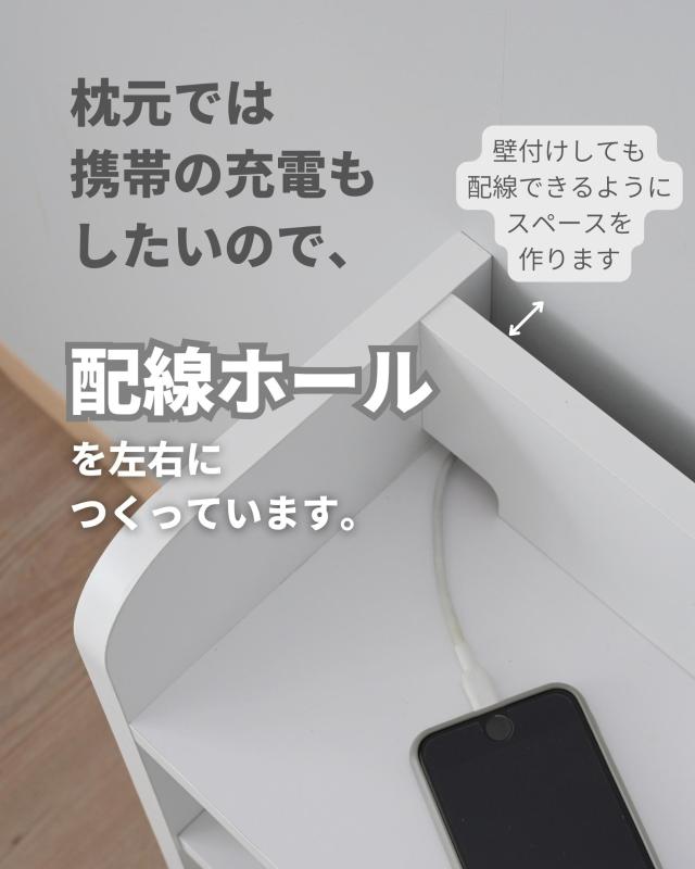 | 商品説明 | ●ベッドのヘッドボードにもなる奥行き20cmのスリムラック ●枕元に小物置きスペースが作れて便利 ●シングルサイズのベッドにちょうどいいサイズ ●天板の左右2カ所にライトや携帯の充電に便利なコード通し穴付き ●可動棚2枚付き(約3cm間隔、11段階調節) ●背面には幅木避け・配線スペース有り ●2台並べてベッドサイドを収納スペースにしてもOK ●コード通し穴:幅4 高さ2cm ●天板有効内寸:幅86 奥行16 高さ10cm ●下段有効内寸:幅42 奥行16 高さ46cm(左右各々) ※2023年12月4日より、カラー再変更:ホワイト、ダークブラウン色になります。 ※プラスドライバーをご用意ください。 |