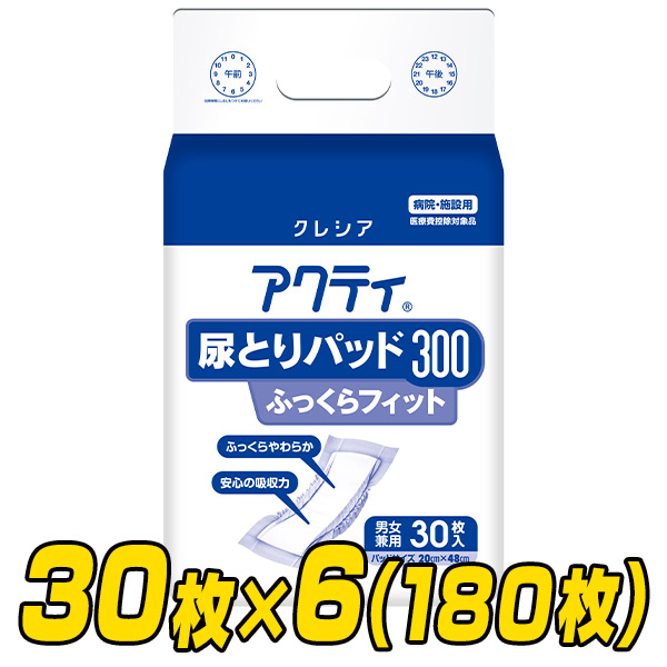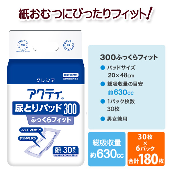 【業務用】アクティ 尿とりパッド300 ふっくらフィット 総吸収量630cc 30枚×6パック(180枚) 尿とりパッド 尿 漏れ 大人用紙おむつ 大人用おむつ 介護用おむつ 男女兼用 業務用 日本製紙クレシア 【送料無料】