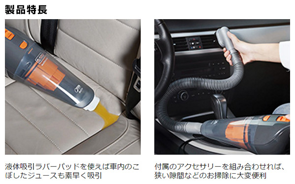 | 商品説明 | ●12V車専用 ●電源:車載バッテリー(シガーソケット) ●集じん方式:乾湿両用 ●連続作業時間:約30分 ●集じん容量:(乾)約175ml、(湿)約125ml ●コード長さ:約5m ●付属品:先細ノズル、ブラシノズル、大型ブラシノズル、ロング先細ノズル、蛇腹ノズル、液体吸引ラバーパッド(ゴム製)、収納バッグ、乾湿両用フィルターケース(ダストケース内に内蔵)、スポンジフィルター、アダプター ●車内でうっかりこぼしてしまった液体も素早く吸引お掃除 ●豊富なアクセサリーで狭い車内でも使いやすい車専用クリーナー ●16年2月 カラー・デザインを一部変更しました |