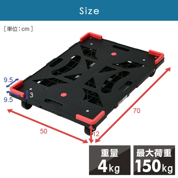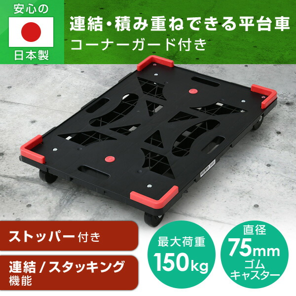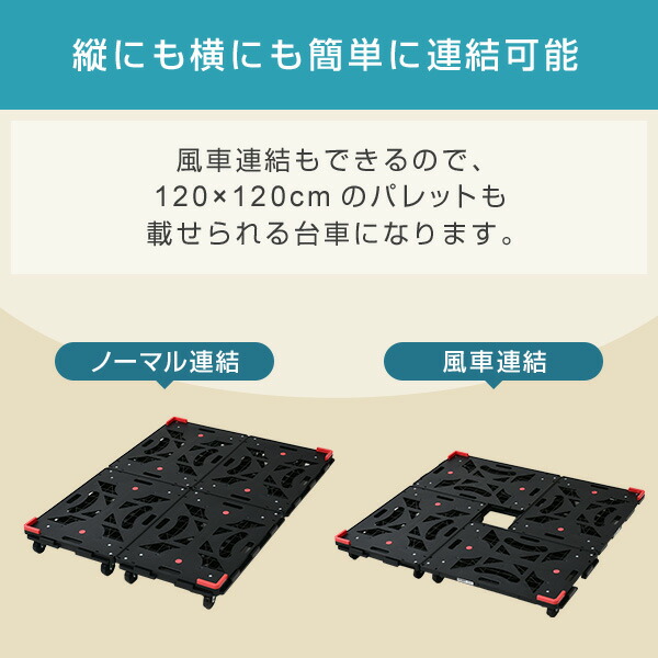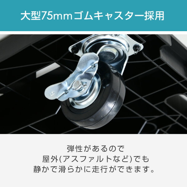 | 商品説明 | ●最大荷重:150kgまで ●キャスター:直径7.5cm 自在4個(ストッパー付き2個) ●70×50cmの大きな積載面で運搬効率がアップ ●4枚連結すればパレット台車に(120×120cm)!通常の連結も可能 ●荷台表面が汚れずに積み重ね可能(荷台表面にキャスターが接触しないため衛生的に使用できます) ●キャスターがゴム製なので屋外(アスファルト)でも静かで走行が滑らか ●荷物ずれを防ぐコーナーガード付き |