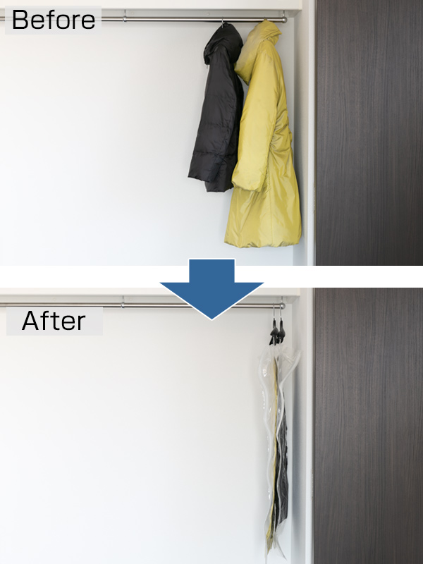 圧縮袋は横から収納できて、間口が広いのでコートなどの出し入れがラクに行えます。