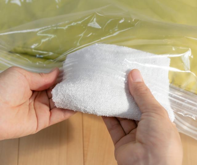 衣類を入れた後、水で濡らしてきつく絞った布でファスナーの内側を拭くと圧縮時の密着性を上げる効果があります。