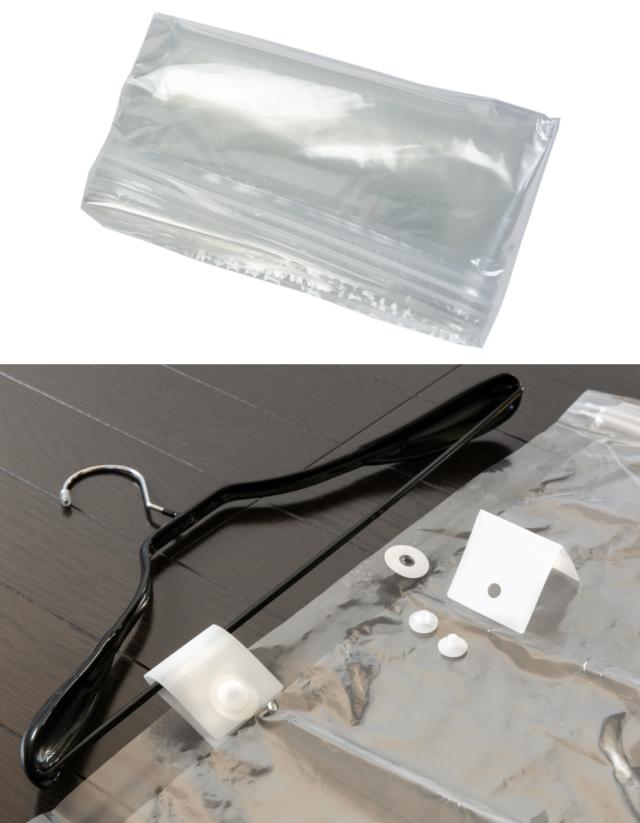圧縮袋は2枚入りです。ハンガーに吊るすのに必要な「吊るせるシート」と「ネジ」も付属しています。