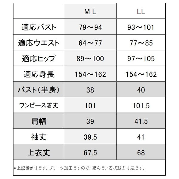 LL バスト(半身)40 ワンピース丈101.5 上衣丈68 袖丈57.5 肩幅41 ワンピース袖丈43