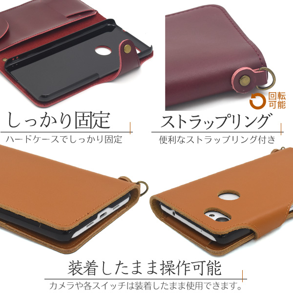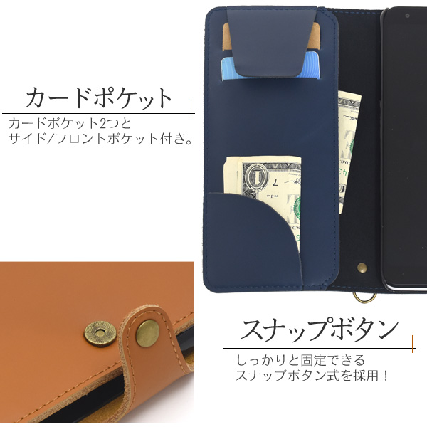 | 上質な牛革を全面に使用した、牛革手帳型ケース。 美しい質感と滑らかな触り心地の牛革を使用しています。 一つ一つ丁寧に制作しています。 実用新案登録済のカード落下防止フラップ付き! 逆さにしてもカード落下の心配がありません。 大切なカード収納時やストラップ使用時などに最適です。 内部ケースはハードケースなのでしっかりとスマートフォンを固定できます。 横開きタイプなので、手帳のように使うことができます。 また、内側にはカードポケット2つとフロント/サイドポケットが付いています。 しっかりと固定できるマグネット式スナップボタンを採用しています。 便利なストラップリング付きで、ストラップなどを装着可能です。 | ||||||||||||||