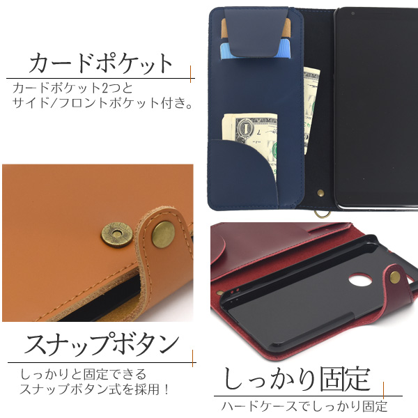 | 上質な牛革を全面に使用した、牛革手帳型ケース。 美しい質感と滑らかな触り心地の牛革を使用しています。 一つ一つ丁寧に制作しています。 実用新案登録済のカード落下防止フラップ付き! 逆さにしてもカード落下の心配がありません。 大切なカード収納時やストラップ使用時などに最適です。 内部ケースはハードケースなのでしっかりとスマートフォンを固定できます。 横開きタイプなので、手帳のように使うことができます。 また、内側にはカードポケット2つとフロント/サイドポケットが付いています。 しっかりと固定できるマグネット式スナップボタンを採用しています。 同じ色の牛革を使用したストラップ付きです。 金具はアンティーク風の金古美色を採用! ナスカンなので取り付けも簡単です。 | ||||||||||||||