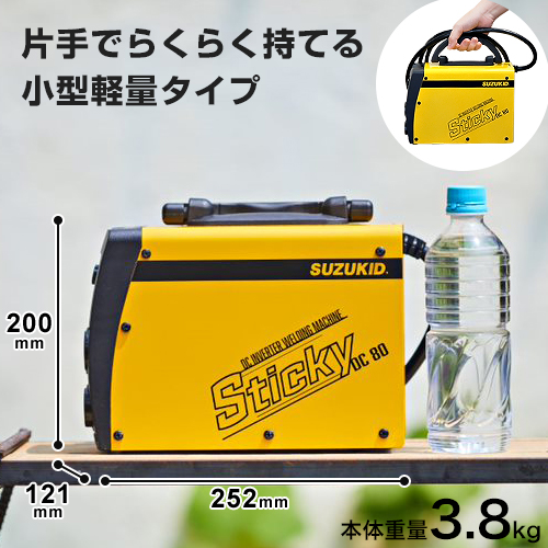 スズキッド 直流インバーター溶接機 Sticky80+スターターキットST-002+肩掛けベルト付きインバータ制御でスムーズに溶接を行うことができ、幅広いジャンルの溶接が可能な直流インバーター溶接機です。スムーズなアークスタートと安定したアークでストレスの無い作業が可能な高性能インバーター搭載。薄板溶接1.2mmから最大5mmまでの幅広い板厚に対応しています。
